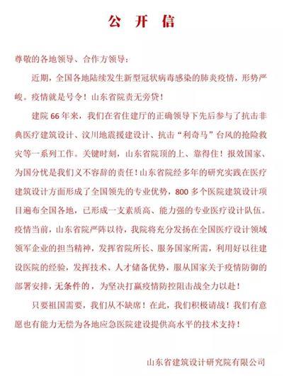 此次新型冠状病毒疫情突然爆发,既是对国家和中华民族团结的冲击,也是对中国医院建设事业的考验。随着疫情的发展,各地开始筹建集中收治新型冠状病毒肺炎患者的应急医院。山东省院作为全国医疗建筑设计的代表性单位,义不容辞地率先向上级主管部门递交了抗疫请战书,并于1月28日向各地政府和合作方发表公开信,积极请战!