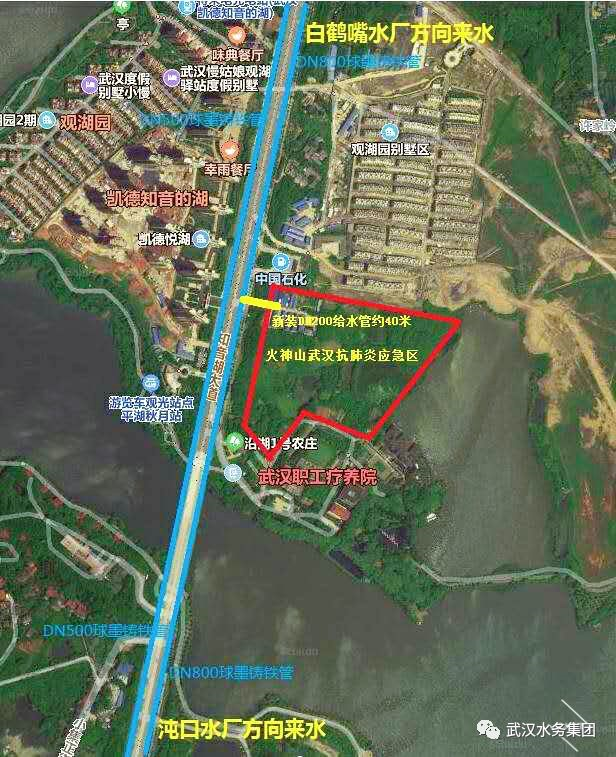 武水集团迅速调集管道工程建设和服务保障的精锐力量,组织武汉水务建设工程公司、蔡甸供水公司参与火神山医院内外供水管道建设;组织武昌供水部参与雷神山医院的外部供水管道连接和服务保障工作。