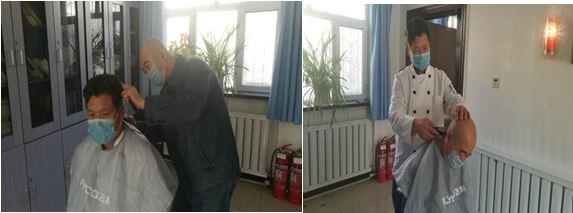 庞青和李国民都是老党员,他们都是主动要求留守为大家做好后勤服务,他们说:“我们是共产党员,一切为了疫情防控,留守多少天都行”。由于疫情和食堂工作的要求,他们双方成了对方的“御用理发师”,同时他们还主动承担了集团几栋家属楼的日常消毒工作,他们没有任何怨言,共产党员的表率作用在实际的工作中得以体现。