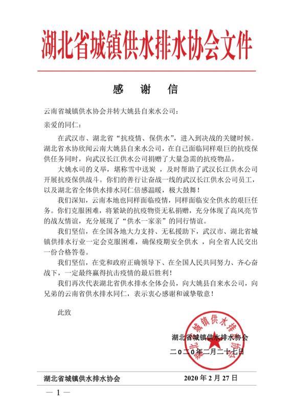 ——大姚县自来水厂向武汉长江供水实业公司捐赠抗疫防护物资