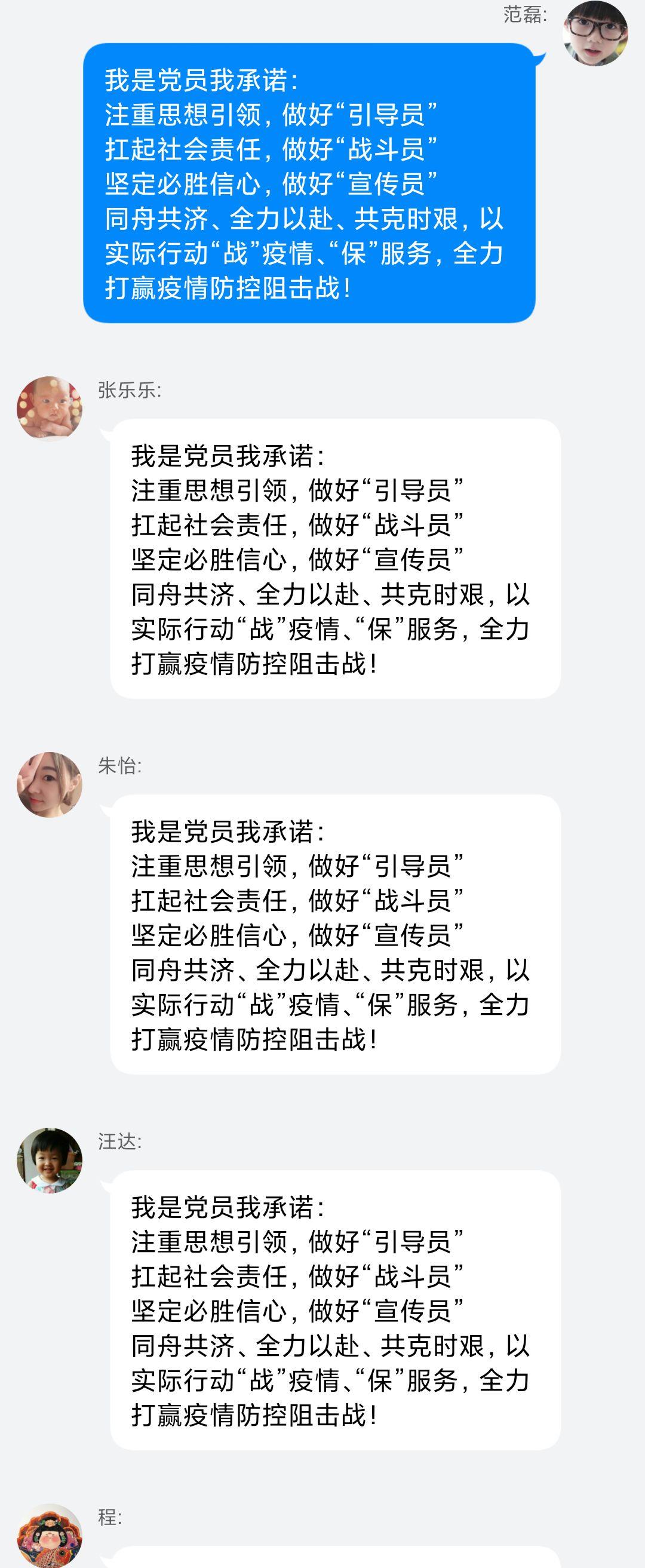 四是主题党日活动,聚力鼓劲“加油站”。正当疫情防控处于胶着期、攻坚期,部门党总支及时下发了《关于开展“战疫情、保服务”主题党日活动的通知》,要求各党支部于2月16日前组织全体党员(可吸收部分入党积极分子和干部参加),通过QQ群、微信群等载体,充分利用居家办公时间或业余时间,开展线上主题党日活动,让主题党日活动成为凝心聚力鼓干劲的“加油站”。各党支部一方面在认真学习公司及上级有关精神的基础上,全体党员做出了“发挥模范作用、带头防控疫情”的承诺;另一方面动员全体党员干部职工持续保持战斗状态,时刻绷紧疫情防控这根弦,把疫情防控工作作为当前最重要的工作,按照公司疫情防控工作要求,切实做好各项防控工作,坚决打赢疫情防控阻击战。部门共有5个党支部88名党员参加了此次主题党日活动。