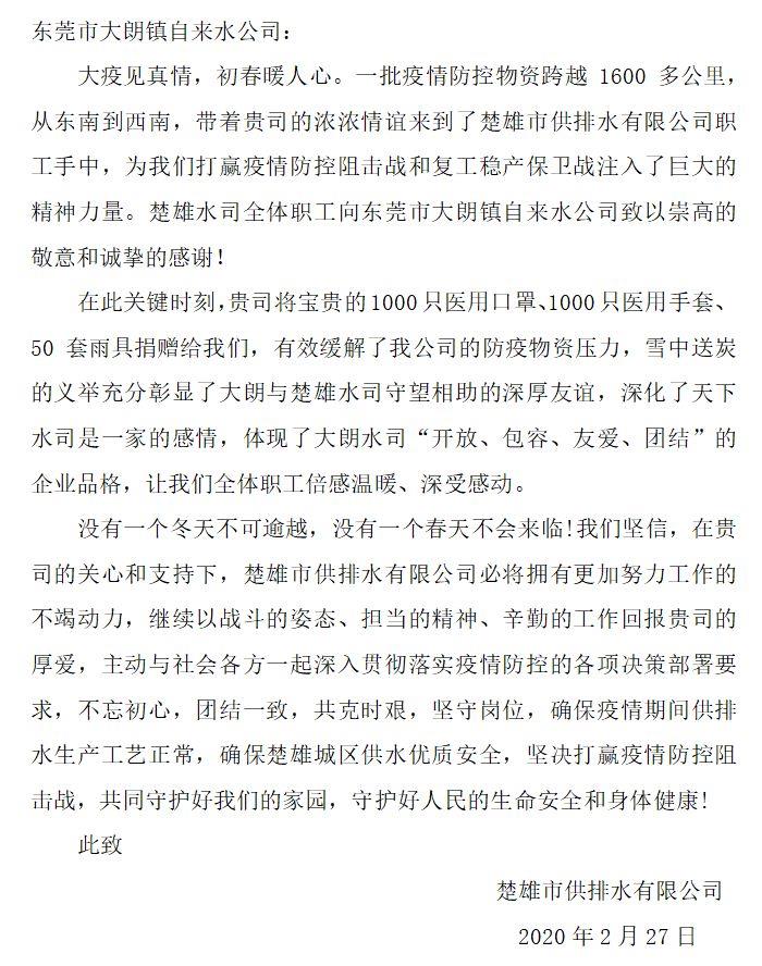 守望相助 共抗疫情——致谢东莞市大朗镇自来水公司