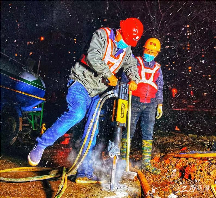 2月13日晚,李华军小组接到热线单,像往常一样第一时间赶赴现场。与平时不同的是,在进驻现场前,李华军会再三叮嘱其检查组员的防护措施。在实施抢修中遇到一些困难,阻碍着开挖进度。“水管上的石头太硬,我力气大,我来打”。李华军拿着液压器使出全身力破解水泥地,瞬间激起大量的粉末,扑面而来,但他仍未动摇,只是偶尔因为用力过度,呼吸不便的时候,稍微拉下点口罩喘口气,抹把汗,又继续操作。“为保障居民能够正常用水,抢在时间的前面,他们现在都在家里呆着,肯定更需要用水。记得有一回连续两天一夜的加班,我们都能克服,这些小问题,不算啥”!李华军边作业边笑着说。