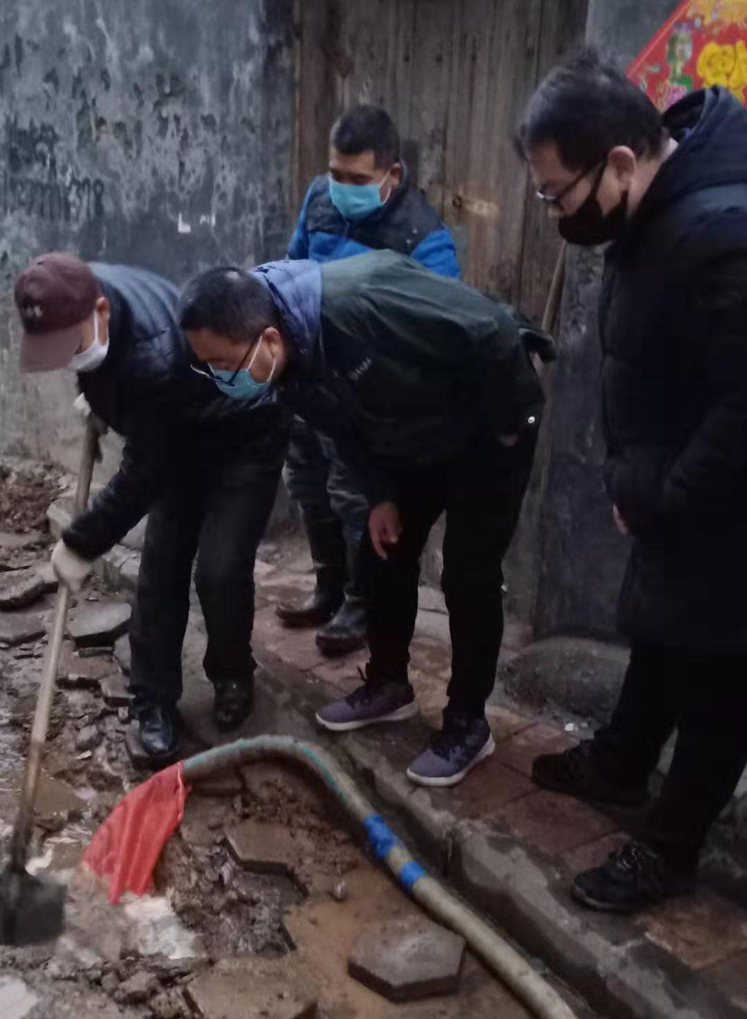 2月4日8点,公司热线电话接到铭基用户说水压小、无水。通过生产调度部门24小时不间断监测市区供水压力情况,了解到供水管网压力正常。但住户接连反应水压小、无水情况,让四分公司经理张伟意识到,一定有情况。他组织抢修人员佩戴好口罩、手套等防护用品,第一时间赶赴铭基了解情况。根据现场反馈,初步判断为供水主管道出现漏水。张伟同志带领抢修人员先排查消火栓、集体用户水表处有无漏水,同时联系管道维护公司副经理郭向军赶到现场展开听漏工作,进一步确定漏水点。功夫不负有心人,终于在下午4点找到了漏点。漏点所在地下有混凝土,这又给抢修工作增加了很大难度,抢修人员二话不说挥起电镐破碎、铁锹开挖,头上、身上沾满了泥土,鞋子和裤腿被泥水浸透,在所有抢修人员的共同努力下,下午7时完成抢修,确保片区居民正常用水。