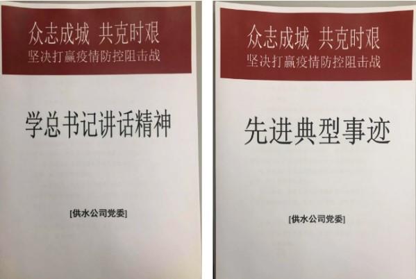 新型冠状病毒肺炎疫情发生以来,习近平总书记发表多次讲话,一线工作者无私奉献,广大人民群众众志成城。在这疫情奋战的关键时刻,水务集团党委下发了《关于开展“学总书记讲话精神、学前方‘战士’感人事迹、学身边先进典型”主题党日活动的通知》。供水公司党委接到通知后,快速行动,确保“三学”主题党日活动落实有效。