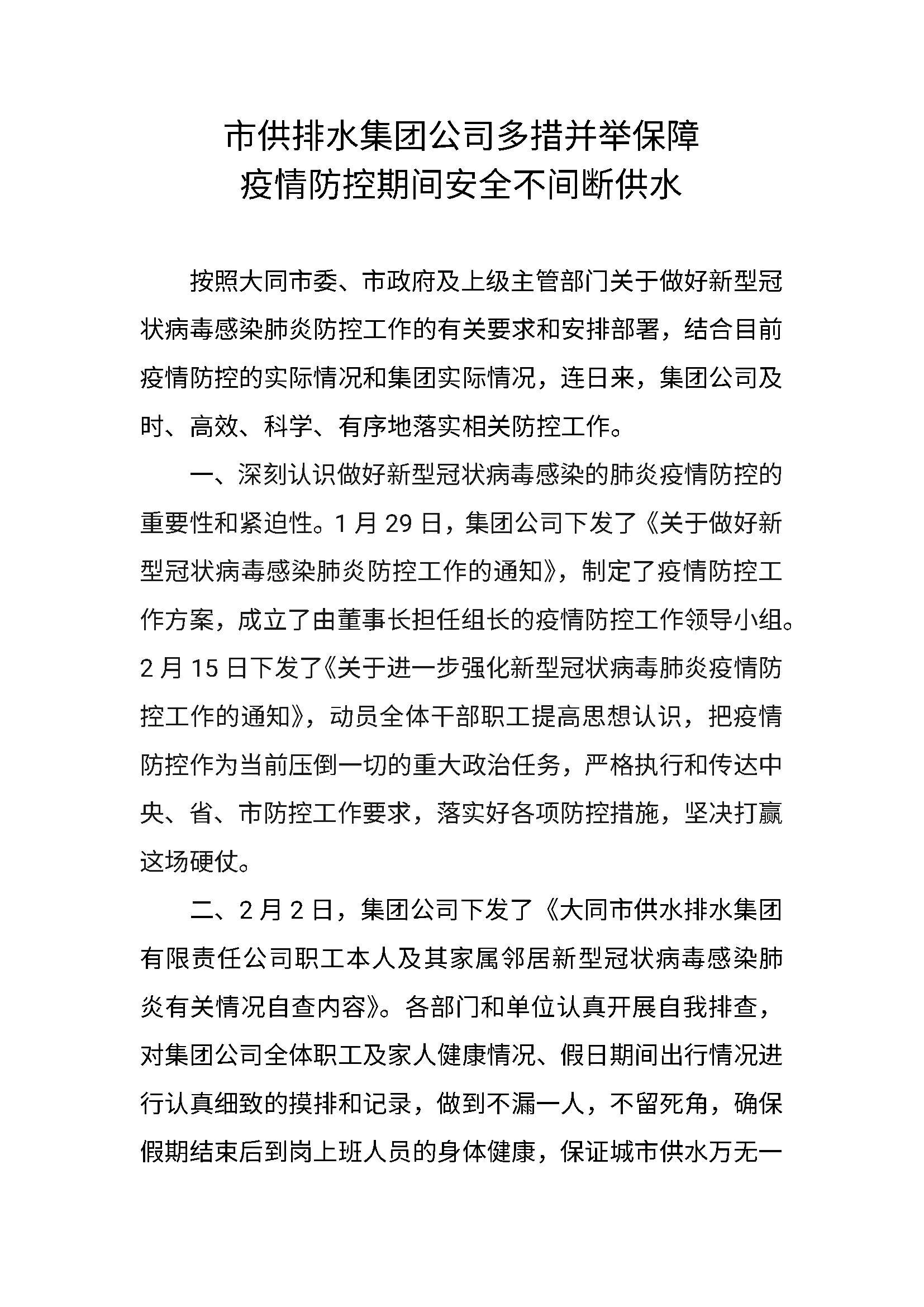 大同市供排水集团公司多措并举保障疫情防控期间安全不间断供水