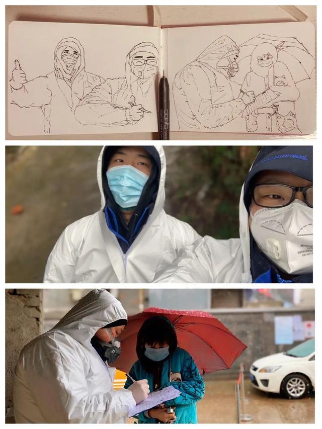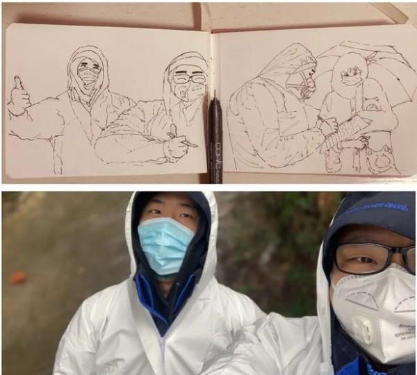 以画言志,袁睿将同事穿上防护服的工作场景挨个画下来。一个个高高壮壮,让人感觉温暖、安全的“大白”形象跃然纸上。