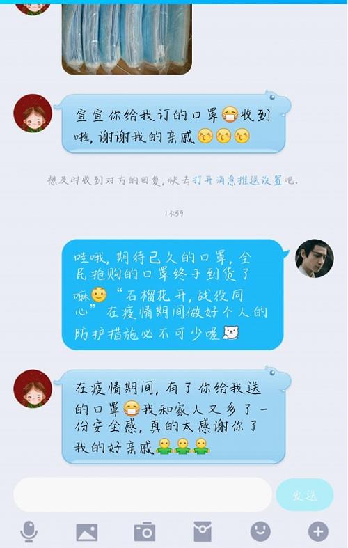“有了你送给我的口罩,我和家人又多了一份安全感,真的太感谢我的好亲戚了。”
