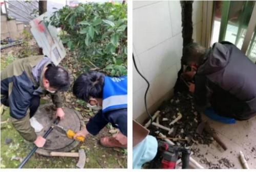 8点40分,抵达维修点。入户之前,检测用户和自己的体温,用酒精消毒全身。这些平常维修没有的程序,是服务队在抗疫特殊时期,为保障安全增设的。冯凯亮和队友们本次的任务,是帮助用户找到漏水点,并修补好破损的管道。因漏水区域在墙体内部,为了尽可能减少用户墙面损伤,他们用小手锤人工一点点砸开墙面,用了整整3个小时才完成任务。