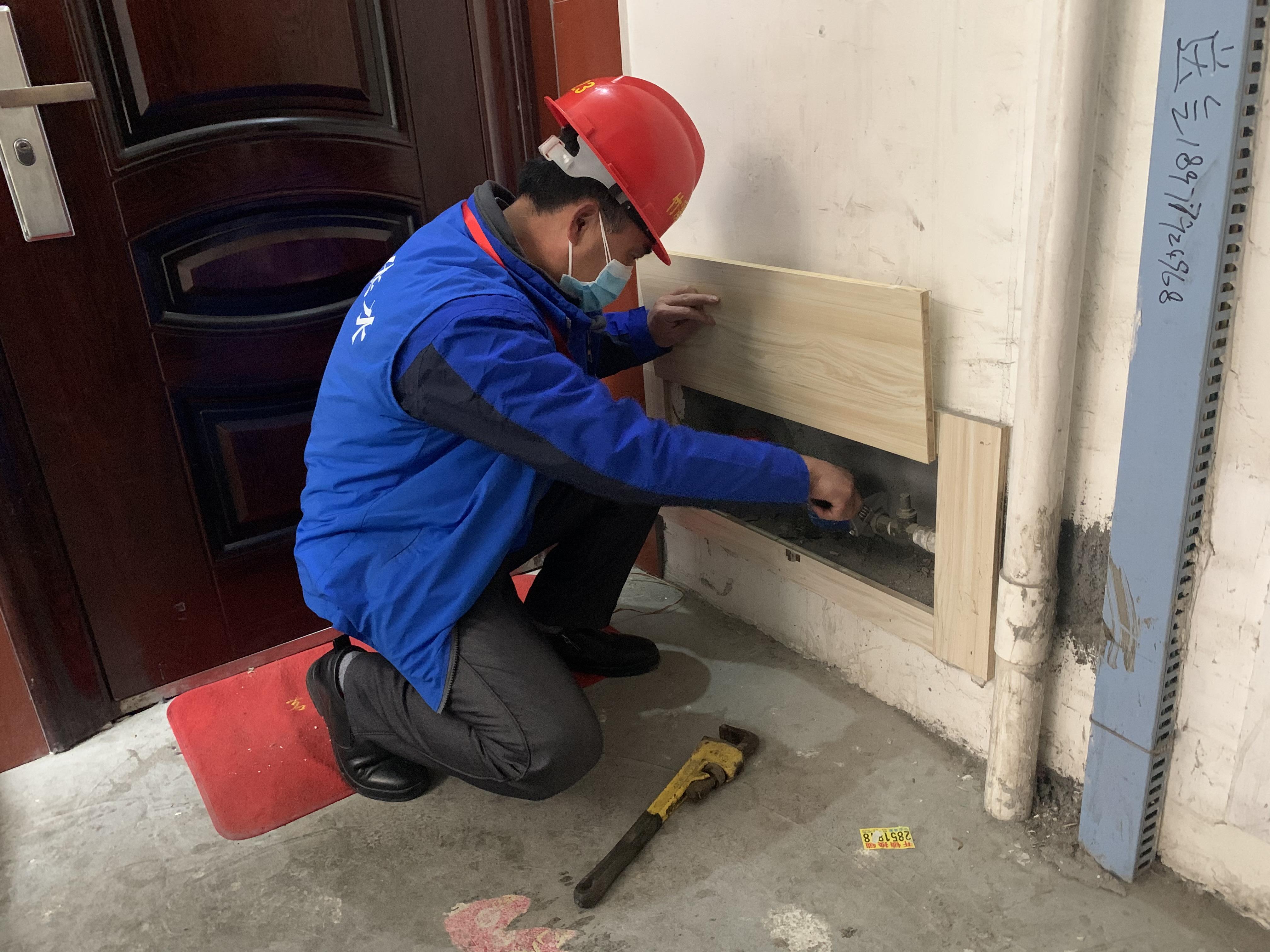 在金铜岭医疗隔离区的供水安装工程施工现场,公司工程队副队长王行平脸上佩戴着口罩,手上拿着管钳和扳手,正在争分夺秒的对供水管道进行对接。短短6个小时,他已经完成了21户供水安装任务,作为从事管道安装20年的专家,公司每一项供水安装工程施工都少不了他的身影。