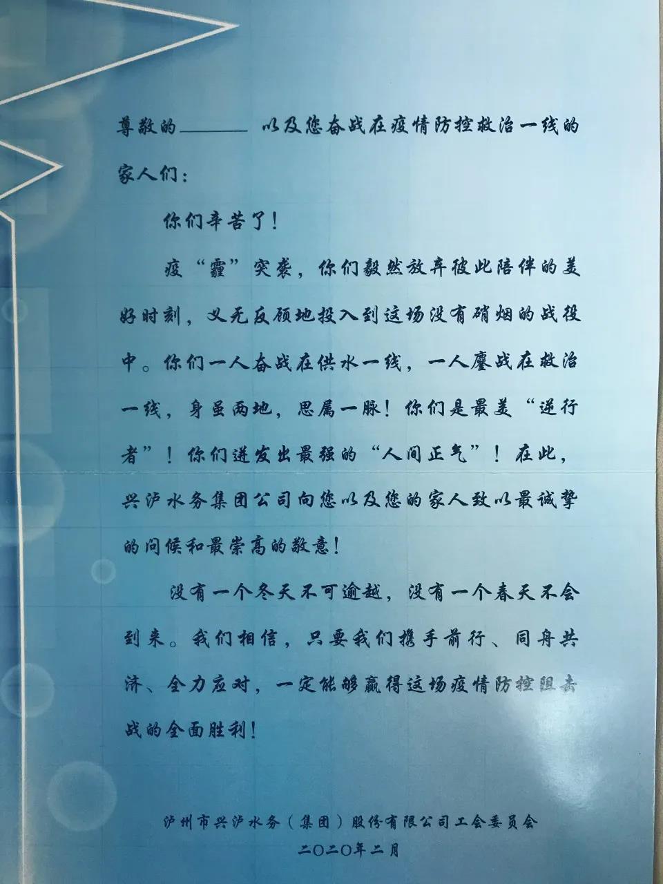 近日,泸州兴泸水务集团工会采取发放慰问信、慰问品等形式,将工会的温暖传递到每一名员工亲属医务工作者。