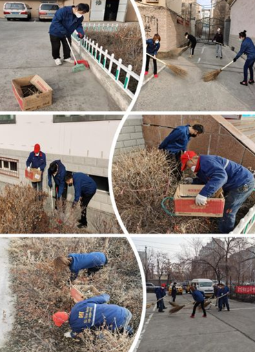 在清洁过程中,大家拿起扫帚、扛起铁锹,相互协作、分工明确。从认真清扫院子里角角落落的残冰积雪、垃圾杂物,到捡拾绿化花池中的塑料袋、烟头、树枝不放过任何死角。手持铁锹和头戴红帽负责清运垃圾的外聘工作人员涂武和李光灿说:“能参加这样的集体活动非常开心,我们要努力维护好我们的工作生活环境,为抗击疫情贡献力量!"