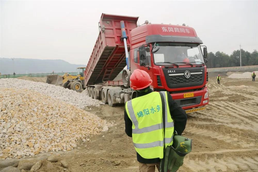 位于绵阳市区城南经开区涪江与木龙河交汇处的施工工地上,机械轰鸣,施工工人们全部佩戴口罩,正在有序紧张作业,工程材料运输车辆井然有序,一派忙碌紧张的施工场景。