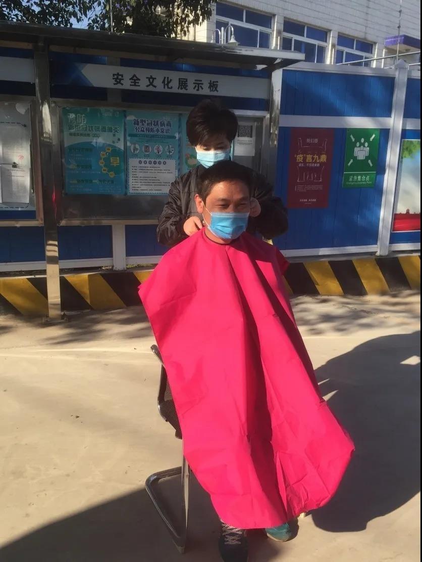 3.送“服务”到工地现在是防控工作最吃劲时期,为减少交叉感染,工地上很多建设者不便到理发店理发,徐泾水厂一名党员科长为他们送去了志愿者服务——暖心理发,虽然技艺不精湛、动作不娴熟,但是得到了建设者们的一致称赞。