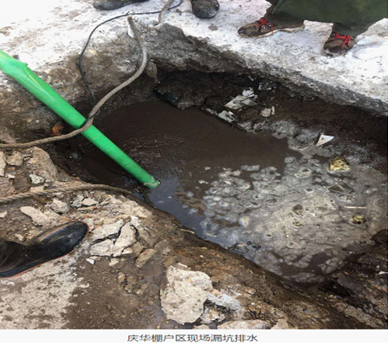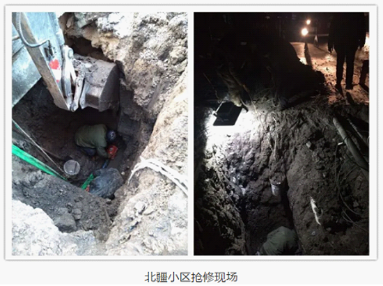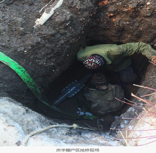 2月11日庆华棚户区内供水管网漏水,物业公司没有维修人员,自来水公司接到求援电话,工程经理带队,立即组织抢险人员奔赴现场,经过现场查看、勘验,确定管线维修施工位置、维修方案后,组织维修管材、管件,抢修队出动机械、人员,在冻土层深达接近2米的条件下,开挖工作坑、抽水将破损的管道断掉重新安装。从上午10点10分至下午16点50分,用时近7个小时将管线维修好恢复通水。