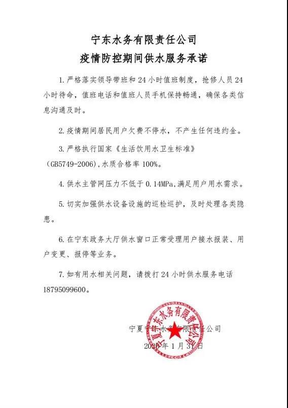 一是提高认识。严格执行疫情期间各项规定,认真做好防控、消毒、隔离等工作,高度重视疫情期间供水服务保障工作的重要性。二是坚定承诺。在疫情期间,全体人员面向社会对安全供水服务作出承诺,铭记承诺内容,做好服务保障工作,并在宁东管委会进行备案。三是不间断服务。在做好在岗服务人员安全防护的基础上,宁东政务大厅供水窗口正常受理用户接水报装、用户变更、报停等业务。四是主动作为。各园区负责人及时掌握各企业疫情期间的生产情况、建设情况,全面了解用户用水情况,以便有的放矢服务用户。五是发挥党员模范带头作用。为减少疫情期间人员聚集,由客服中心主任和副主任在宁东24小时轮流值班,现场处理用户诉求,24小时接听用户来电,提供相关业务受理和咨询服务,其余员工在家办公,每日各园区负责人汇报工作进展情况,切实做好新型冠状病毒防控期间的安全供水服务工作,不怠慢、不推脱、不哑声,风雨同舟,保障供水,共抗疫情。