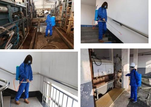 她们身背30多斤重的喷雾器,按时定点到办公与生产一线对粗细格栅、办公楼梯进行全方位消杀,认真负责、一丝不苟,不放过每一个角落。