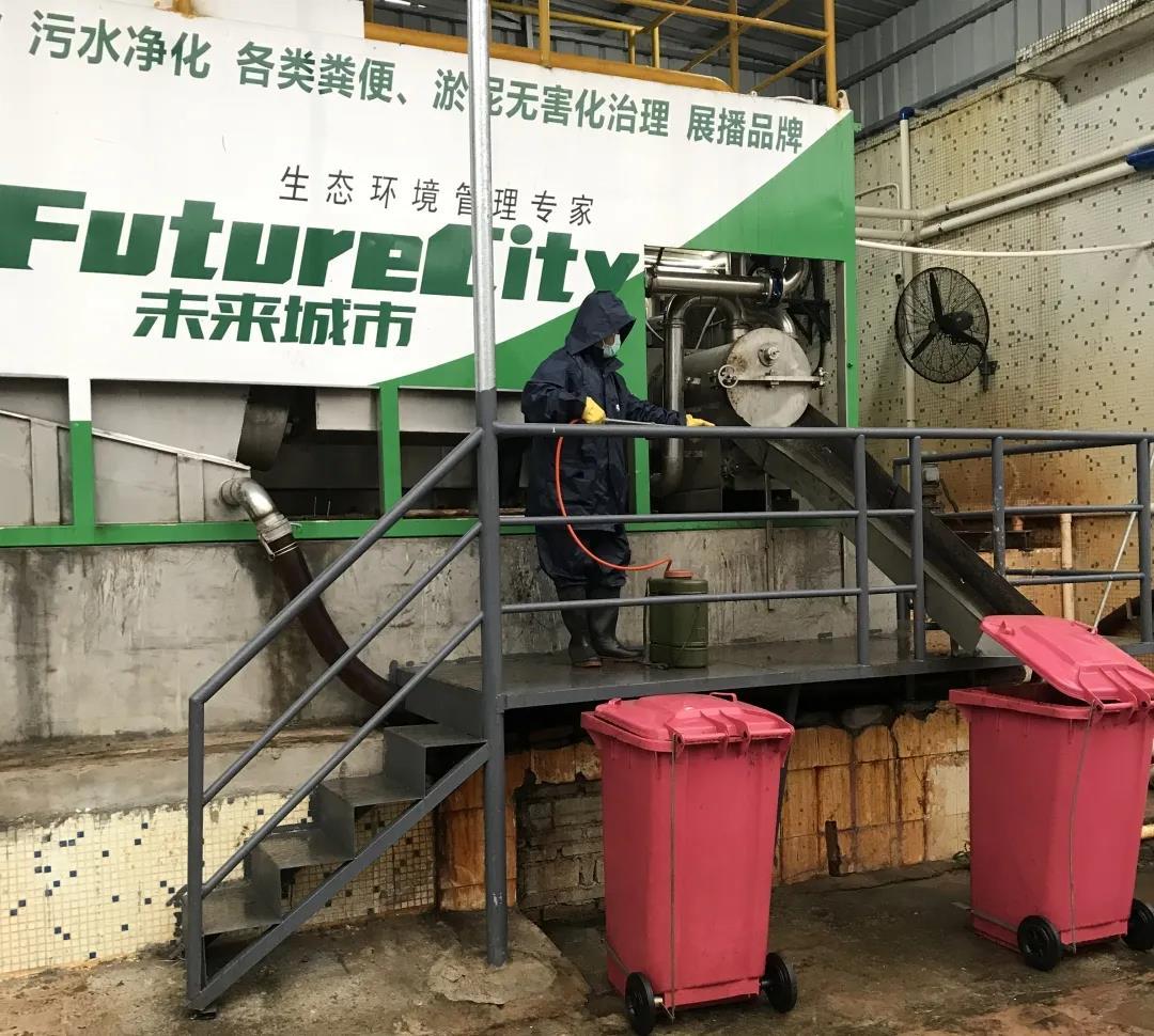 市固体公司承担的大推车山生活垃圾填埋场运营、旗杆石垃圾填埋场(BOT项目)监管以及蓬江区化粪池粪渣处理工作也是本次疫情阻击战的重要“战场”之一。为有效阻断新冠病毒通过粪口传播的途径,市固废公司针对垃圾渗滤液及粪渣处理的作业特点,及时制定不同的消杀作业方案,加强作业人员安全防护配备;特别是在粪渣处理工作上实行定点卸料,严格限制该区域的人员进出,以降低接触风险,并加大对粪渣处理全过程的卫生消杀频次,防止污染外泄,确保垃圾渗滤液、粪渣处置工作安全、规范运行。
