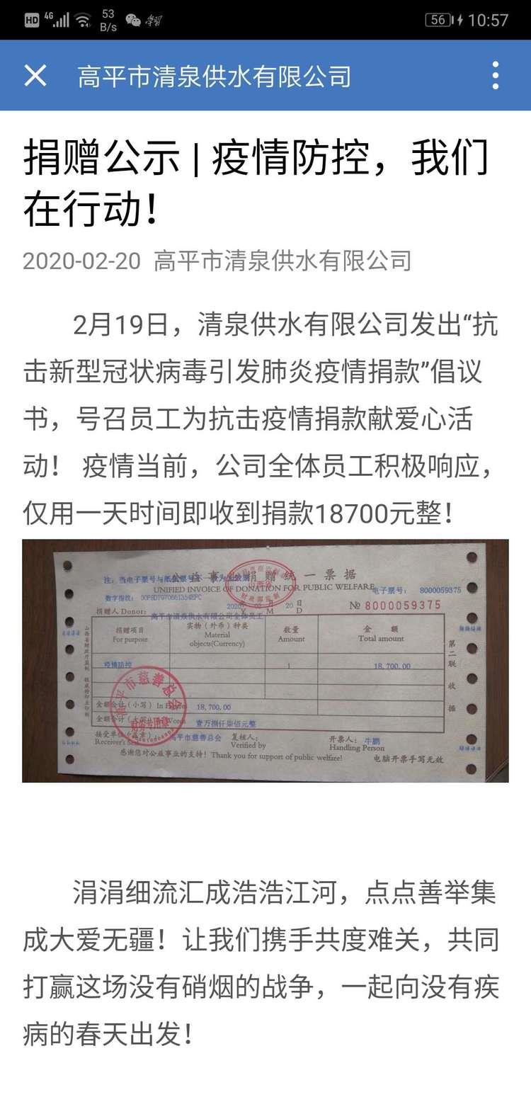 一、高平市清泉供水按照疫情防控工作的总体要求,坚定信心、同舟共济、科学防治、精准施策,制定疫情防控应急预案,成立疫情防控应急指挥领导小组,公司经理担任总指挥,各部门负责协调管理本部门疫情防控工作。