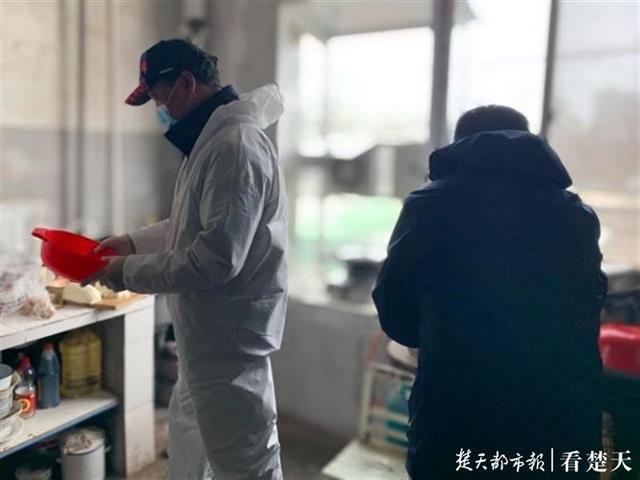 在与社区网格员商定后,当天中午1点半,李可与同事吴昊文、谢天在完成值守任务后,与网格员一起来到老人家中。入户前,他们互相进行身体以及自带食材的消毒措施。