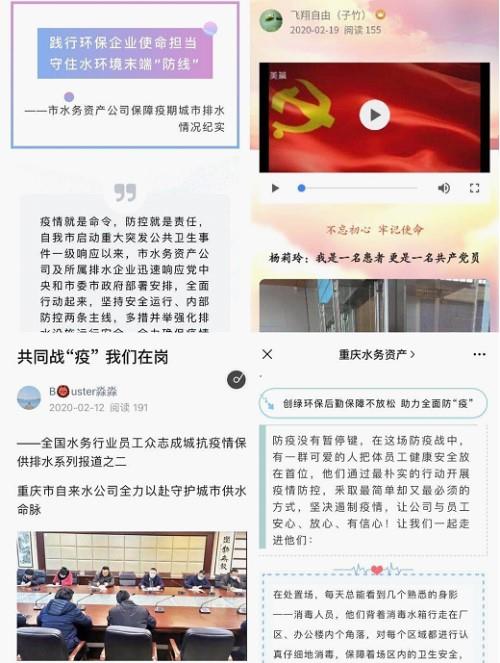 恢复出刊后,3月已连续推出“抗疫专刊”6期,集中推出重庆报道12篇,3月18日在头版头条的显要位置刊登《并肩抗疫,践行责任——重庆市水务资产公司携手苏伊士新创建捐赠钱物超1100万元》,3月8号刊登《重庆水务集团领导深入一线督导疫情防控和生产运行工作》。同时,协助编辑制作市水务资产公司微信公众号内容29期。