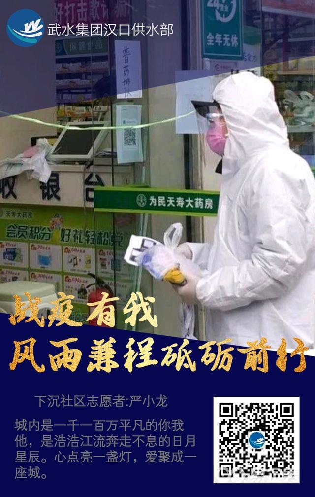 硚口营业所的严小龙作为团支部书记、入党积极分子,平时就乐于参加志愿服务,供水服务进社区、"汉马"志愿服务、集团退休老人帮扶……都能看到他忙碌的身影。在支部招募下沉社区疫情防控志愿者时,他第一时间报名参加。