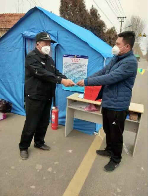 “你好,从哪里来?到哪里去?近期有没有接触过湖北来的人?请测一下温度,做一下登记。”“麻烦带上口罩,为你好也是为大家好,谢谢配合”……这是一天里谭晓龙说的最多的话语。穿着红色志愿服,戴着红袖章,站在山东胶州市里岔镇谭家二村村口执勤点上,每天不断重复相同的话语,给每一位出入的村民做好登记把关工作。