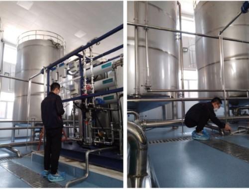 直饮水二干水厂值班人员进行每日自检和厂区内外清洁消杀工作,详细记录水表读数和生产运行参数TDS值。操作制水系统,检查设备运行情况。