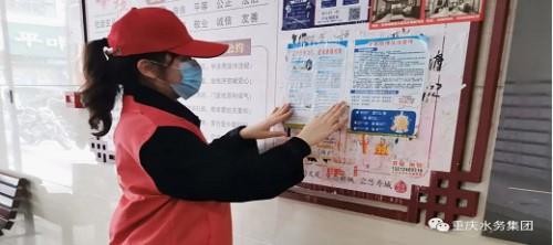 长寿排水公司员工志愿者正在小区张贴宣传海报