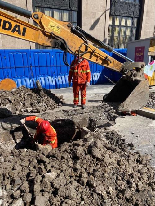 南京东路历史悠久,随着时间的推移和城市的建设,地下管线繁杂无比,为了保障施工安全,管道分公司联系所有沿线管线产权单位做详尽的管线交底,尽可能多的开挖样洞样沟,摸清状况,严格按照安全规范进行施工。挖机的每一次操作都小心翼翼,关键点位采用“人工”挖掘的方式。