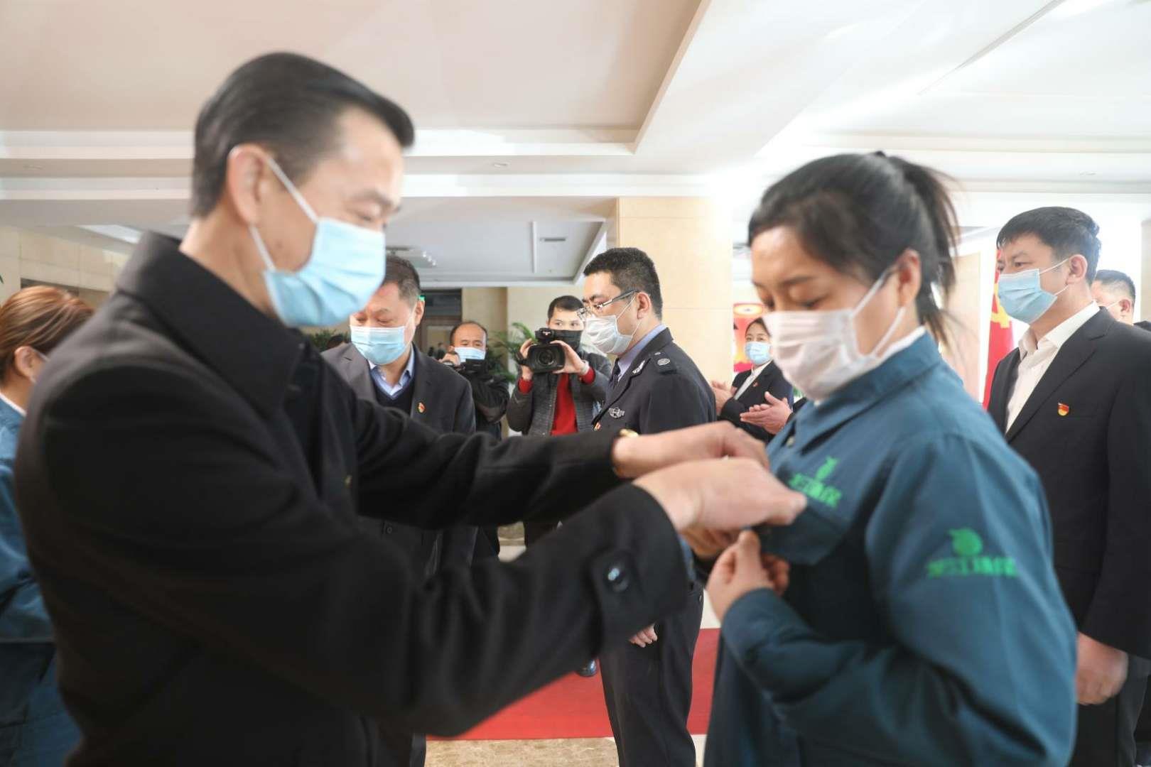 在入党仪式现场,佳木斯市非公党工委书记程旭、供水公司党委书记、总经理王景燏为两名新党员佩戴党徽并颁发《党章》。