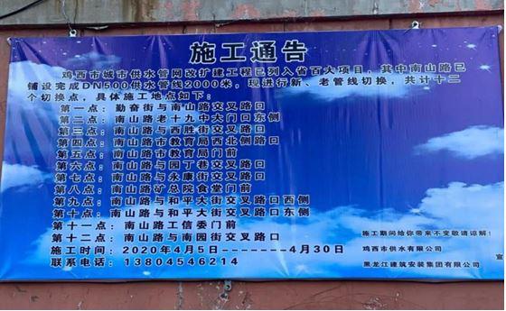 2020年4月5日上午8时,在黑龙江省鸡西市市委、市政府及市住建局的正确领导下,黑龙江省“百大项目”之一的鸡西市城市供水管网改扩建工程正式复工。此项工程由鸡西市供水有限公司承建,由黑龙江建筑安装集团有限公司负责施工。该条改造的管线建于40年前,不但跑冒滴漏严重,并且在安全供水、保障水质等方面存在很大的隐患。此项工程建设完成后,能有效降低漏失率,解决水质污染问题,保证沿线居民的供水安全。