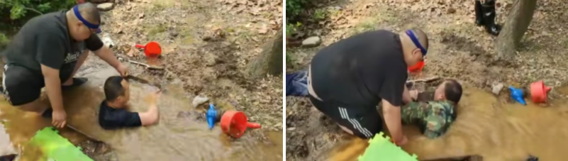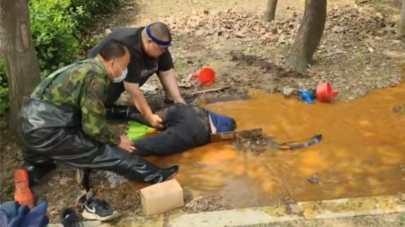 4月9日中午11点,在枣庄市市中区文化东路铁道游击队纪念基地附近的绿化带里,出现了一幕让人感动的场景,绿化带里一处浸满水的坑池上,一个人趴在坑边,上半身悬空,深吸一口气之后,猛然扎进水中,后面两个人紧紧拽住他的腿脚。附近路人纷纷围观,不知发生了什么。