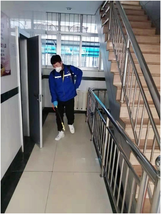 王杰森在疫情防控期间为各营销所办公场所进行消毒工作场景