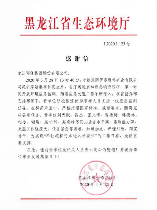 本次应急行动中,龙江环保集团本着“地方政府支持配合、社会企业积极参与”的原则,在省指挥部的安排部署下,积极承担社会责任,严格按照国家标准和规范要求,配合专家组,全力以赴支援一线应急监测,为实现“不让超标污水进入松花江”的工作目标做出了龙江环保人的贡献。4月22日,龙江环保集团收到了省生态环境厅发来的感谢信,对龙江环保集团在这次抢险工作中所做的工作和突出表现给予了充分肯定和高度评价!