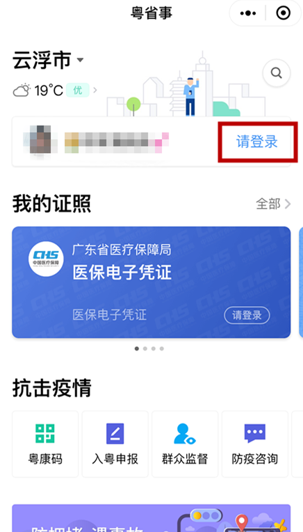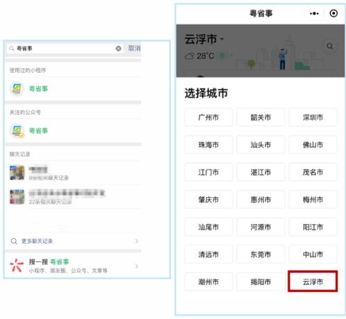 也可以微信打开小程序搜索“粤省事”,进入小程序后选择城市“云浮”即可。