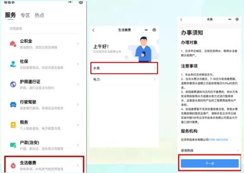 1> 进入“粤省事”云浮专版小程序主界面点击服务中的“生活缴费”→“水务”→“下一步”→进入用户绑定的主界面