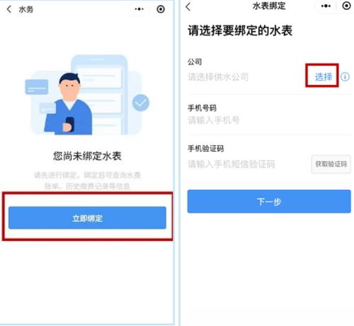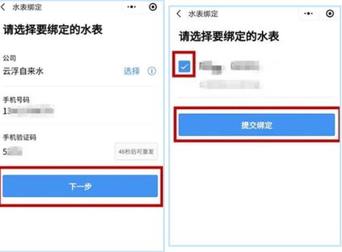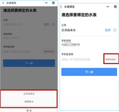 2> 在绑定界面,点击“立即绑定”→可选“云浮自来水”或“德源供水”→手机号码(水司系统登记的联系号码)→“获取验证码”→接收验证码。每次获取验证码的有效时间为60秒,如果超时未能获取到验证码,可以再次点击“获取验证码”进行获取。