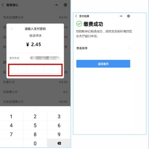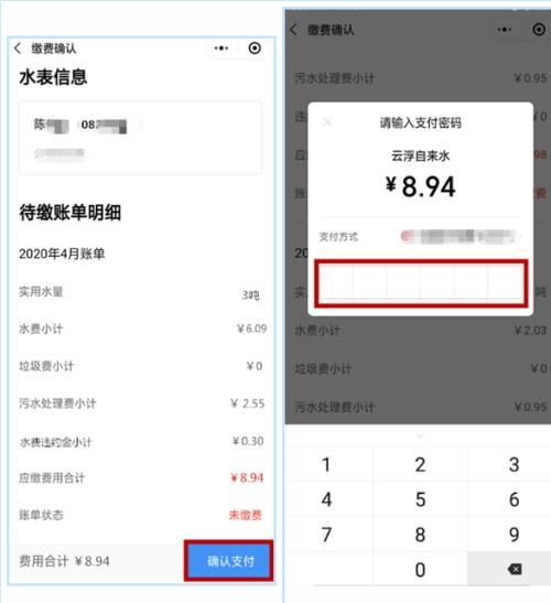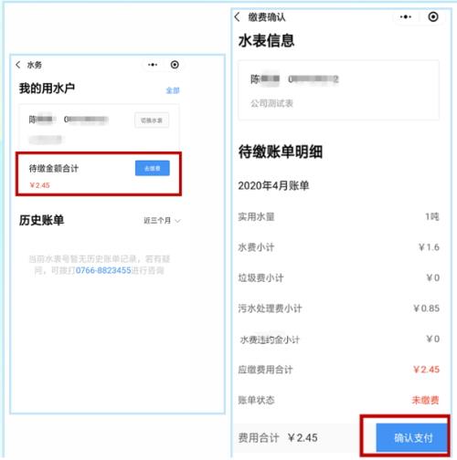 1> 选择绑定列表中的水表,“去缴费”→显示该用户水表需缴交总金额的信息 →“确认支付”。