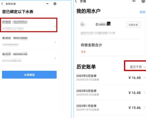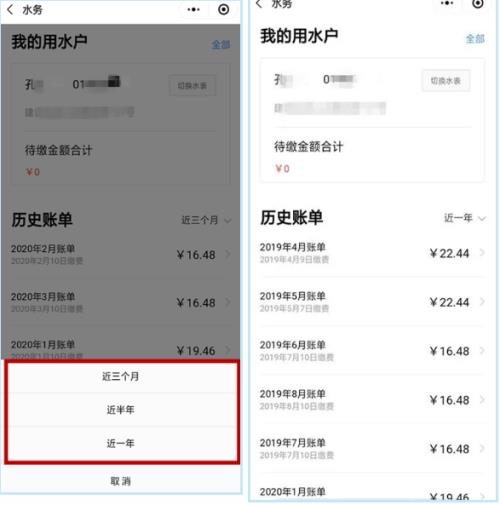 点击选择的水表信息,点击历史账单“近三个月”→水费账单查询界面→选择查询的期限