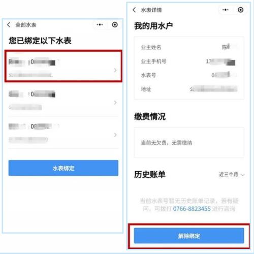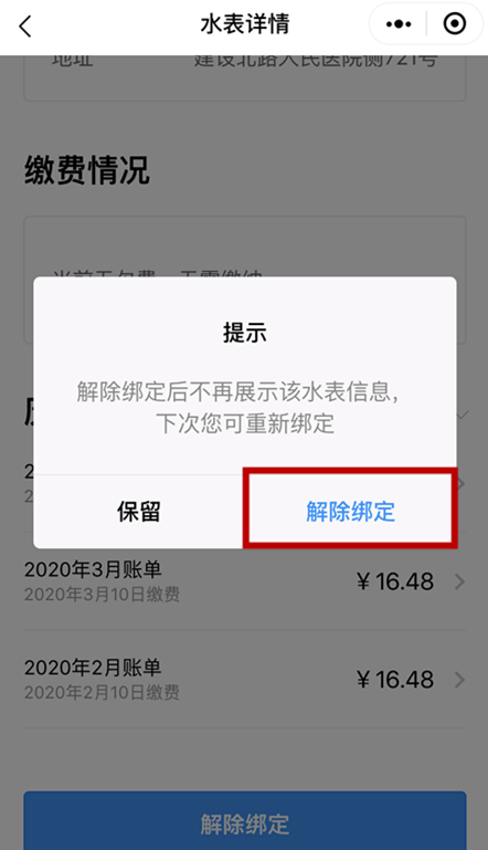 点击需要解绑水表信息,点击“解除绑定”→,弹出“提示”对话框,点“解除绑定”