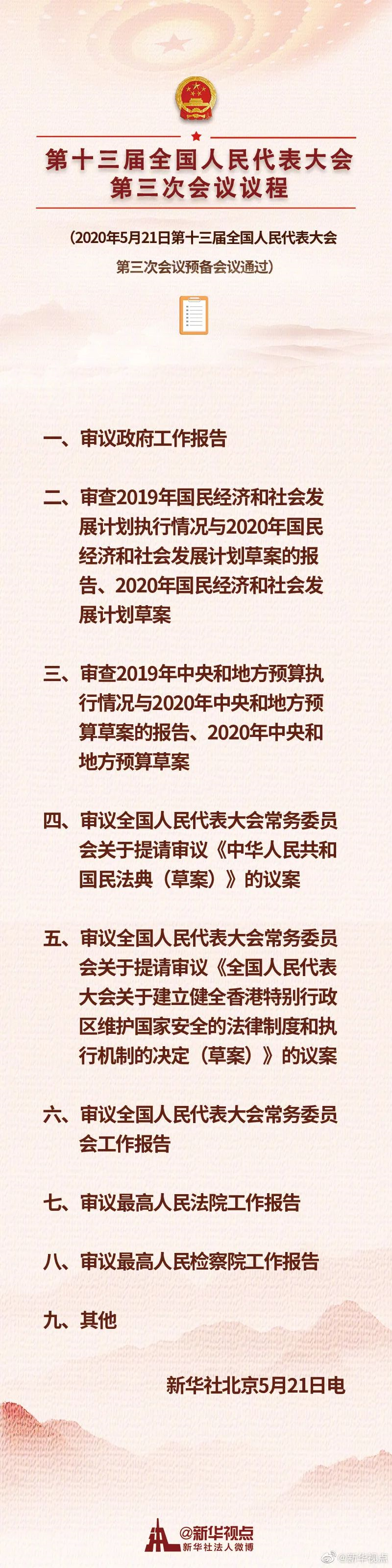 张业遂介绍,本次大会将审议《全国人民代表大会关于建立健全香港特别行政区维护国家安全的法律制度和执行机制的决定(草案)》。