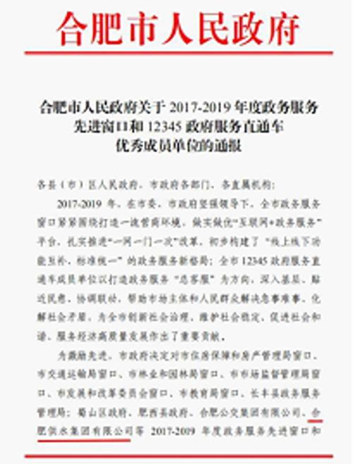 合肥供水集团获评2017-2019年度12345政府服务直通车优秀成员单位称号