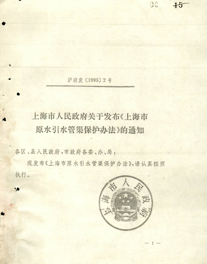 原水管理:1995年供水处制定了政府规章《上海市原水引水管渠保护办法》,对引水管渠保护范围和控制范围内的活动进行了具体规范,保护原水管渠生命线工程的安全运行。目前,本市引水管渠总长400多公里。经过20多年的实施,考虑到科学技术水平的进步,新型管材的应用,施工工艺水平的进步以及提高地下空间的利用效率,供水处于2016年启动《办法》的修订,历时两年多,于2018年4月12日重新公布实施。这次修订扩大了适用范围、调整了保护范围并强化了保护要求。