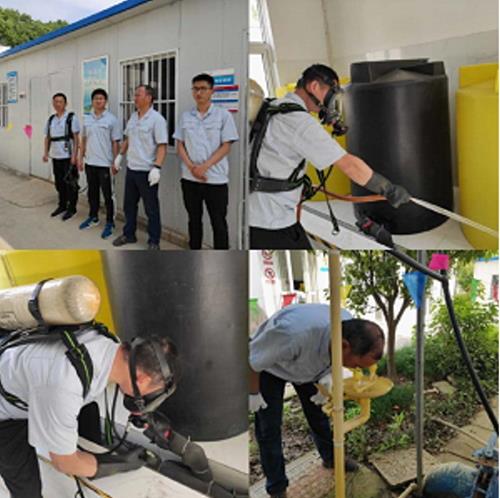 动员阶段,演习指挥首先向大家介绍次氯酸钠的理化性质和防护注意事项,演示如何正确穿戴正压式空气呼吸器、耐酸碱服等防护用具,接着讲解如何根据现场次钠泄漏情况进行应急处理。演习开始,制水班员工在巡检时,发现次氯酸钠投加管道损坏导致次氯酸钠溶液泄漏,现场污染较为严重。巡检人员立刻电话汇报厂长,厂长接到报告后立即启动应急预案,召集全体员工拉起警戒线,限制污染区域人员进出。接着由制水班员工穿戴好防护用品,进入事故现场关闭存储罐总阀门,切断泄漏源头;并开启加氯间排气扇进行通风,用大量自来水冲洗现场,将泄漏的次氯酸钠液体彻底清除。最后由维修人员进入现场更换管道,恢复生产。