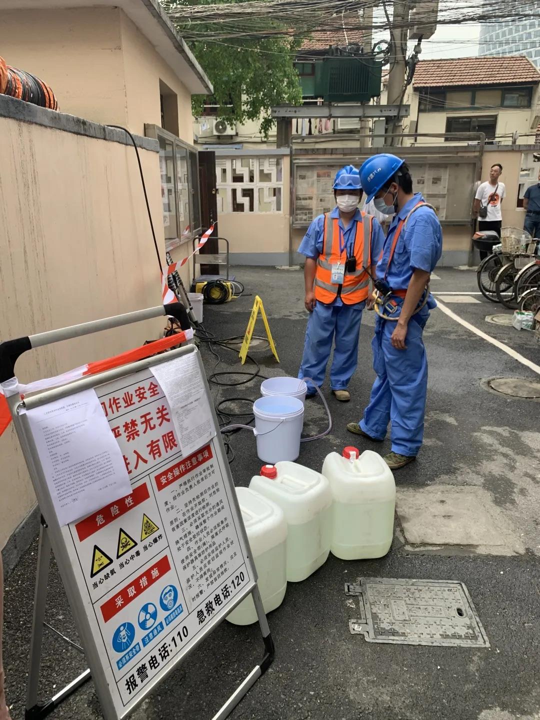 城投水务集团供水分公司介绍了水池水箱清洗消毒工作情况,受疫情影响,上半年水池水箱清洗消毒工作较往年有所滞后,供水分公司目前已经加大人力投入,力争6月底前完成已接管小区的清洗消毒工作。现场清洗消毒作业单位介绍了清洗流程,所有作业人员必须持四证上岗,分别是居民身份证、健康证、登高作业证、有限空间作业证,消毒剂必须到卫监部门备案,施工人员必须穿戴专用工作服装,配备高压水枪进行清洗作业。清洗人员先用清水和毛刷对池壁箱体冲刷干净,再用消毒剂进行喷洗、浸泡15分钟以上后,用清水冲洗,经现场检测余氯、浊度合格后恢复通水,同时采集水样送实验室化验。整个清洗作业,清洗流程规范,安全防范到位,清洗达标通水。