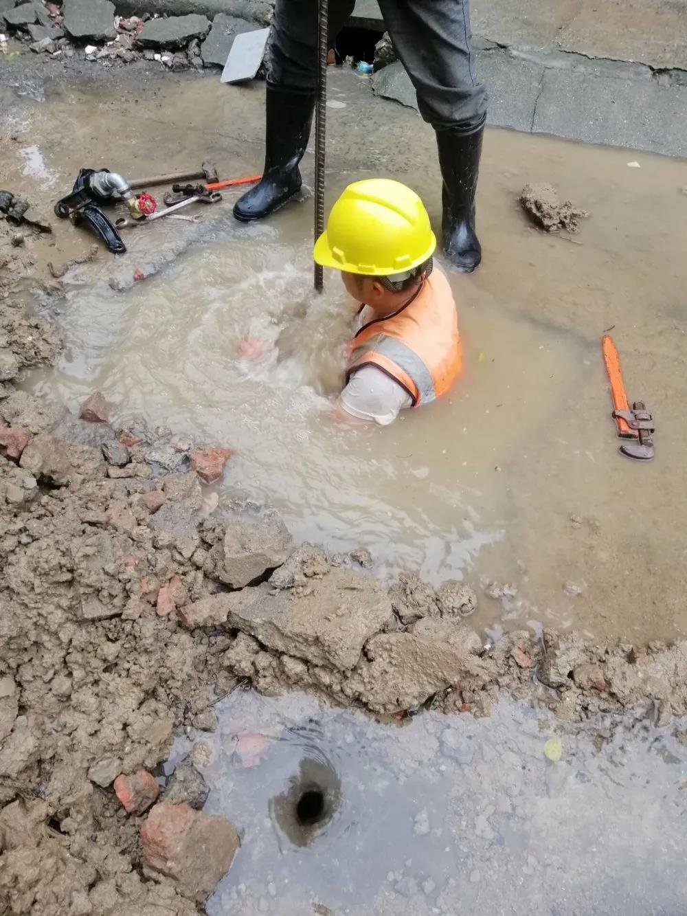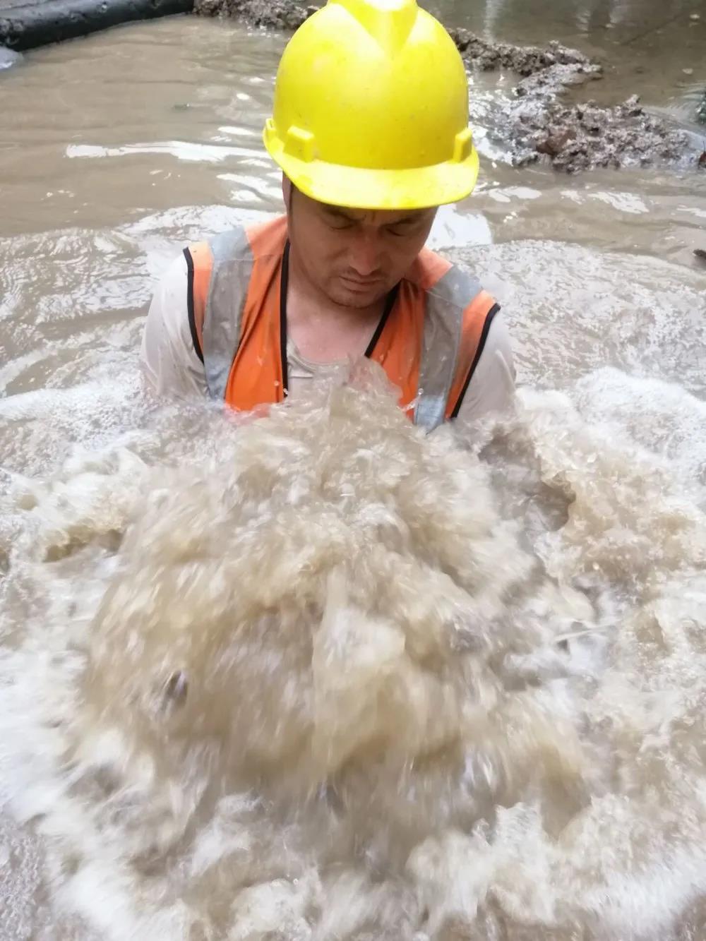在前期试停水一小时之后,管道内的水量和流速已经降低到满足操作需求的程度。然而在维修开始时,由于汆水的问题,管道内积水一下子从破损口涌了出来,几十秒就已经淹没了操作基坑。有着五年现场抢修经验的田恒师傅,立即跳入没到胸口的泥浆水中,摸索着拆卸弯头进行更换操作。