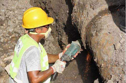 管道坑内黝黑的身影、砂轮与管道摩擦的电火花、被汗水浸湿的衣襟,在午后的烈日下尤为耀眼。经了解,为保障附近居民用水安全,枣庄市供水总公司安装公司施工人员正在加班更换老旧供水管道。