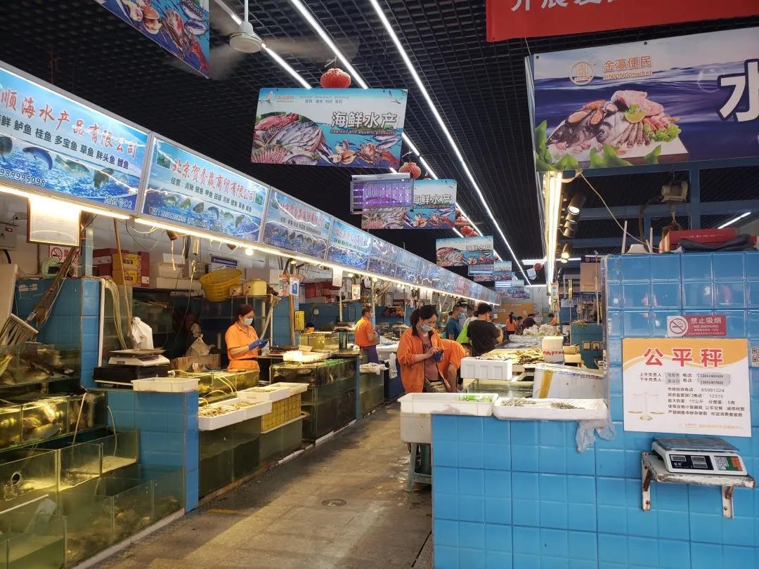 在金瀛生鲜市场,记者看到近20个水产摊位中各种鱼类、小龙虾、扇贝等水产货源充足,无一摊位关门歇业,但顾客很少。记者在市场的半小时的时间内,生鲜市场内仅有5家客人光顾,大多是去肉类生鲜摊位询问购买,仅有一人过来了水产摊位。