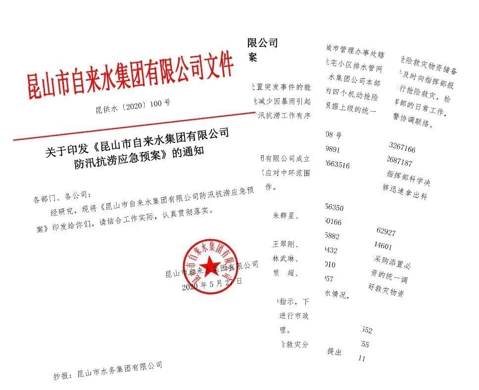 成立防汛工作领导小组,设立抢险救灾调度中心,及时传达雨情预警,统一下达各项指令,制定《昆山市自来水集团有限公司防汛抗涝应急预案》,严格落实防汛领导带班值班和24小时防汛值班制度,细化防汛各方面工作措施,做到令行禁止、使命必达。